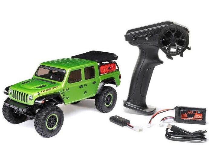 In der Box findest du neben dem zusammengebauten und fertigen Rig einen Spektrum 2,4-GHz-Sender, einen 350-mAh-LiPo-Akku und ein praktisches USB-Ladegerät. Für den Sender sind sogar vier AA-Batterien im Lieferumfang enthalten. Erlebe dein eigenes Überlandabenteuer im RC-Stil mit dem Axial SCX24 Jeep JT Gladiator – ein Fahrzeug, von dem du weißt, dass es für alles bereit ist!