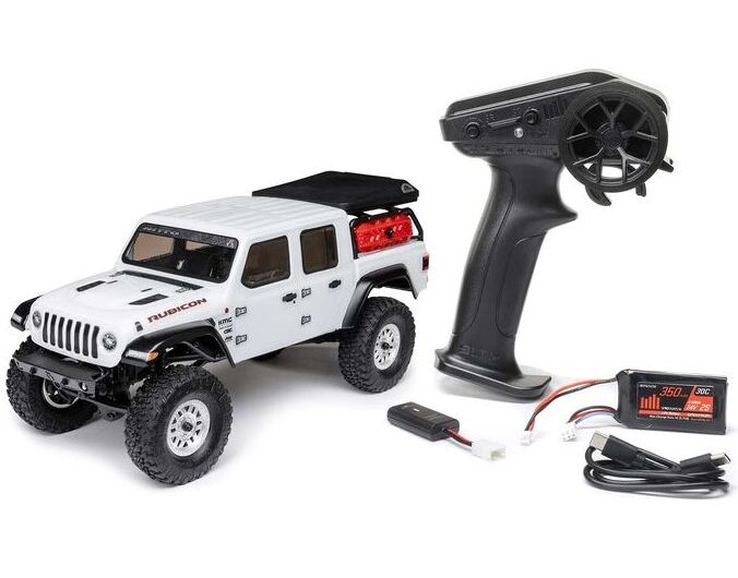 In der Box findest du neben dem zusammengebauten und fertigen Rig einen Spektrum 2,4-GHz-Sender, einen 350-mAh-LiPo-Akku und ein praktisches USB-Ladegerät. Für den Sender sind sogar vier AA-Batterien im Lieferumfang enthalten. Erlebe dein eigenes Überlandabenteuer im RC-Stil mit dem Axial SCX24 Jeep JT Gladiator – ein Fahrzeug, von dem du weißt, dass es für alles bereit ist!