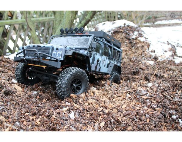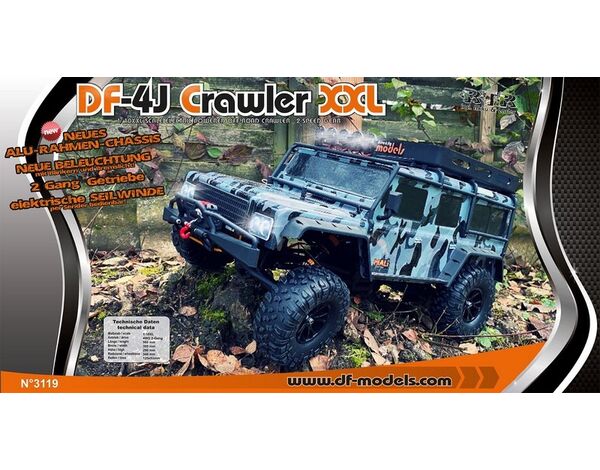 Die 2023-Edition ist mit einem speziellen, LiPo-tauglichen, Crawler Regler sowie einem Spezial-Crawler-Motor ausgestattet. Die Starrachsen mit Metall-Differentialsperren trotzen jedem Gelände und lassen die unmöglichsten Fahrmanöver im Gelände zu. Die robusten Alu-Karosserieaufnahmen, die nun zusätzlich mit Alu-Profilen verstärkt wurden, verleihen dem Modell zusätzliche Steifigkeit. Öldruckstoßdämpfer mit Aluminiumteilen geben dem Modell die richtige Federung. Das per Fernsteuerung schaltbare 2-Gang-Getriebe lässt zügiges Fahren oder sehr langsames Crawlen zu. Die maximale Spitzengeschwindigkeit ist zudem per Dual-Rate an der Fernsteuerung von 0 – 100 % stufenlos einstellbar. Ein Metallgetriebe-Lenkservo steuert Ihr Modell immer präzise wohin Sie wollen. Ebenfalls über die 5-Kanal-Fernsteuerung schaltbar ist die bereits eingebaute NEUE LED-Beleuchtung mit Blinkern, Bremslicht usw. Die im Sondermodell verbaute Seilwinde mit Stahlseil kann ebenfalls per Fernsteuerung bedient werden (Vor-/ Rückwärts). Viele Zubehörteile (optional erhältlich) wie z. B. eine Allradlenkung lassen viel Spielraum, um das Modell zu individualisieren und zu tunen. Das Modell ist Ready To Run und wird mit einer 5-Kanal 2,4 GHz Fernsteuerung, NiMH-Akku und Steckernetzlader geliefert. Eine Fahrzeit von über 60 Minuten ist mit dem DF-4J möglich.