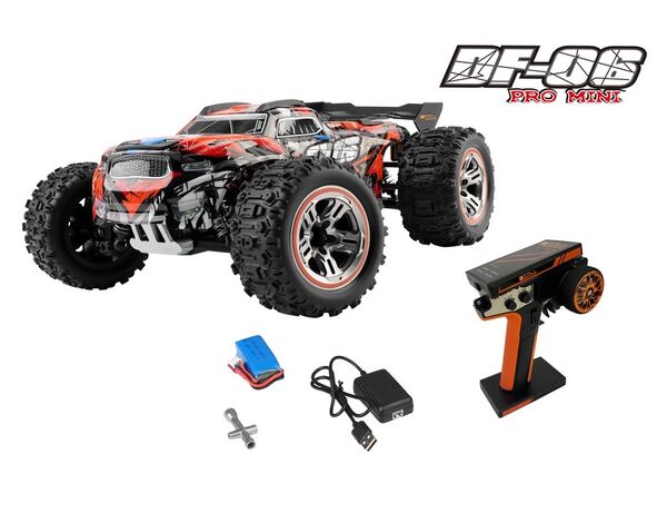 Der DF06 PRO MINI aus der Advanced Line von DF Models ist ein Brushless Truck im Maßstab 1:18. Das Modell kommt fahrfertig aufgebaut (RTR) mit Fernsteuerung, Akku (LiPo Power) und Ladegerät (USB-Ladekabel). Der DF06 PRO MINI ist ein 4WD Truck mit einem 5000kv Brushless Power-Motor und einer leistungsstarken Reglereinheit ausgestattet.