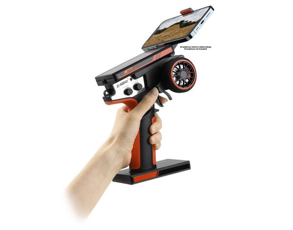 Die Fernsteuerung bietet ein weiteres Highlight … diese hat eine integrierte Handy-Halterung. Sie können Ihr Smartphone an der Fernsteuerung befestigen und haben somit die Möglichkeit z. B. Actionvideos selbst zu drehen, keine 3. Hand oder 2. Person zum Filmen nötig, Sie können sich voll auf die Steuerung Ihres Modells konzentrieren.