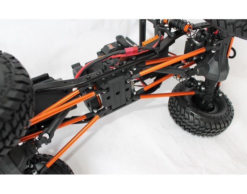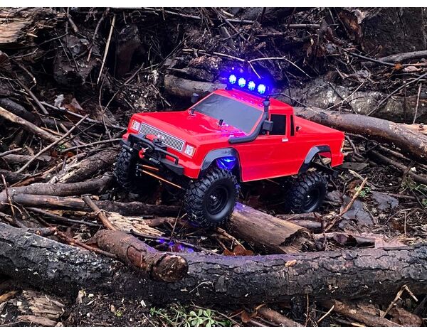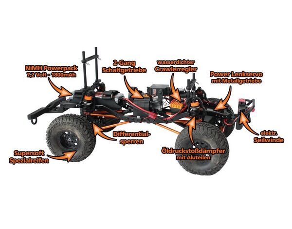 Ein 2-Gang-Schaltgetriebe sowie eine elektrische Seilwinde runden das Modell ab. Über die neue 5-Kanal-Anlage lassen sich die LED Beleuchtung ein-/ ausschalten, das 2-Gang-Schaltgetriebe bedienen und die Seilwinde vor und zurück steuern. Es sind bereits viele Aluminiumteile verbaut. Die Karosserie ist höhenverstellbar um diese so auf die individuellen Bedürfnisse anzupassen. Extrem Geländegängig, lange Fahrzeit und Supersoftreifen lassen das Crawler-Herz höherschlagen.