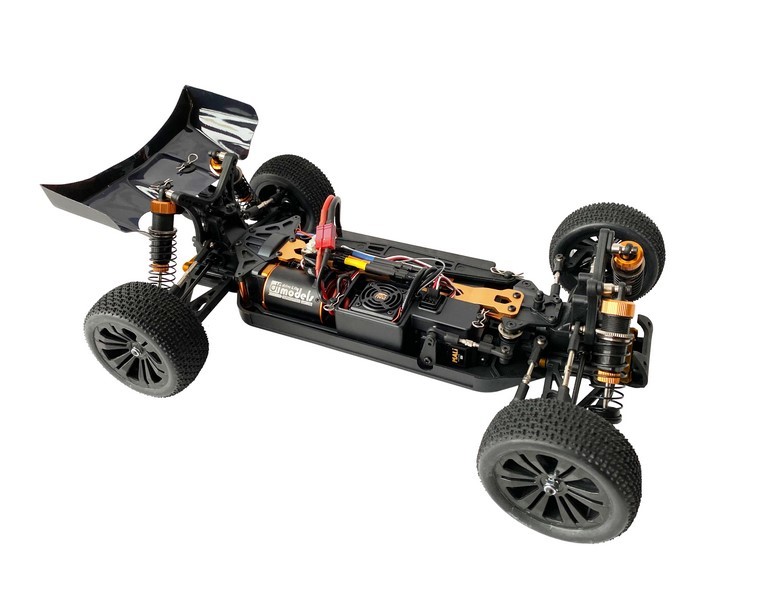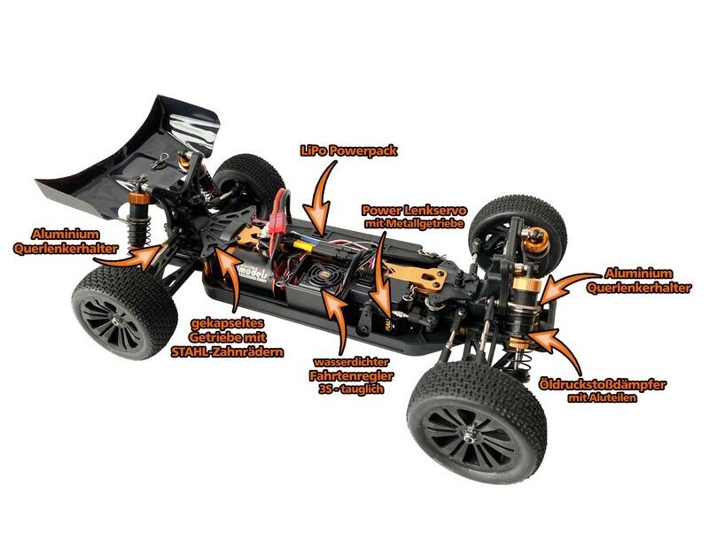 Weiterhin selbstverständlich ist die wassergeschützte Elektronik sowie ein hochwertiger, Regler der durch Zuverlässigkeit und Qualität überzeugt. Das Modell ist komplett kugelgelagert und mit Aluminium-Dämpfer-Teilen ausgestattet