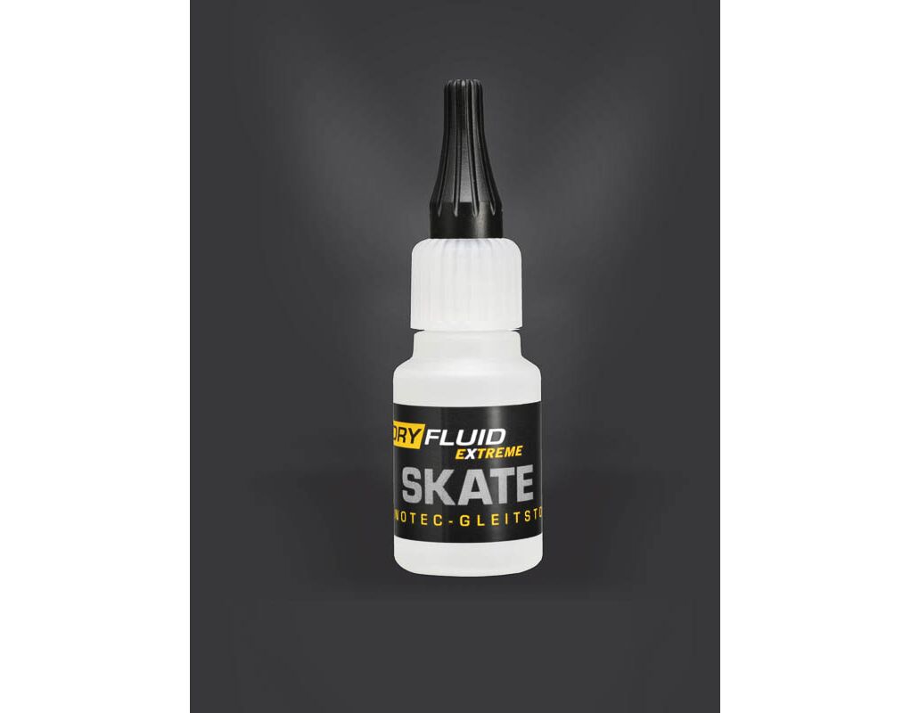 DF023 DryFluid Skate Highspeed Gleitstoff (20 ml) Grosse Flasche! Dry Fluid Extrem Skate - Innovativer Gleitstoff für Kugellager und Wellen Die Wirkung von DryFluid extreme Skate setzt dort ein, wo andere Schmierstoffe ihre Grenzen zeigen. Niedrigste Gleitreibung, höchste Speedwirkung und geringste Staub- und Schmutzbindung waren die Hauptziele der Entwicklung des innovativen Fluids. Neueste Erkenntnisse der Luftfahrt- und Fahrzeugtechnik und die Erfahrungen leistungsorientierter Skater sind die Innovationspaten des neuen Gleitstoffes für Wellen und Lager. Was ist DryFluid Extrem Skate? DryFluid Extrem Skate ist eher ein Gleitstoff als ein klassischer Schmierstoff. Er ist die konsequente Umsetzung technologischer Forschung auf die Bedürfnisse des Sport- und Freizeitbereichs. DryFluid ist kein Wachs, ist nicht ölend, nicht fettend und ist frei von Silikonen. Durch die Verwendung von Trockenpartikeln, Gleitpolymeren und High End-Gleitfluiden wird eine bisher unbekannte Schmierwirkung erreicht ohne dabei weder Staub noch Schmutz zu binden. Die Leistungssteigernde Wirkung von DryFluid Extrem wird jeden Skater begeistern. DryFluid Extrem Skate Produkteigenschaften Geringste Gleitreibung für Leichtgängigkeit und die Reduktion des Verschleißes Verringert den Leistungsverlust an Wellen und Lagern Mehrstufiges Gleitstoffsystem mit Sofort- und Langzeitschmiereffekten Bindet keinen Staub und Schmutz Extrem gutes Kriechvermögen Höchste Materialverträglichkeit mit allen gängigen Metallen, Kunststoffen und Gummiwerkstoffen Hervorragende Haft- und Korrosionsschutzeigenschaften Die Anwendung von DryFluid Extreme Skate Hauptwirkung von DryFluid Extreme ist die Reduzierung des Gleitkoeffizienten und damit der Kraftverluste durch Reibung. Eine anfänglich mehrmalige sparsame Anwendung erhöht den Langzeiteffekt. Zu behandelnde Wellen und Lager gut reinigen und vor Auftrag DryFluid Flasche zum Aufmischen der Feststoffpartikel kurz schütteln. Erleben Sie den Speedeffekt nach dem Auftragen von DryFluid Extrem ! Innovatives highspeed Gleitfluid für Wellen und Lager von Inline-Skates und Skate-Boards. Enthält hochleistungs Schmierkomponenten aus der Luft- und Raumfahrttechnik. Erhöht den Speedeffekt durch extrem niedrige Gleitreibung. Bindet weder Staub noch Schmutz. Hervorragende Langzeit-Schmiereffekte. Mit Feindosierspitze für die punktgenaue Anwendung. Inhalt 20 ml 1. Allgemeine Daten: Produktbezeichnung: DryFluid Skate Farbe: Flüssiger Zustand: weißlich transparent Ruhezustand: Weiß Dichte: Im flüssigen Zustand: 0,85 g/cm³ Im trockenen Zustand: 1,06 g/cm³ Siedepunkt flüssig: 82 Grad Celsius Viskosität: Im flüssigen Zustand (20 Grad Celsius): 7,5 mPa s Im trockenen Zustand: Nicht bestimmt Temperaturbereich: Temperaturfestigkeit: - 50 Grad Celsius bis 160 Grad Celsius Empfohlener Temperaturbereich: - 20 Grad Celsius bis 120 Grad Celsius Spezifischer elektrischer Widerstand: Messung im trockenen Zustand nach DIN EN 50359 Komponente Microkeramik: 10 E+12 Ohm x cm Komponente Kunststoff-Gleitpolymer: 10 E+16 Ohm x cm Komponente Gleitfluid: 1,2 x 10 E+3 Ohm x cm Gesamtleitfähigkeit: > 1,5 x 10 E+3 Ohm x cm 2. Schmierstoffeigenschaften: Druckfestigkeit nach DIN 51347: 270 N/mm² Reibeigenschaften im Kugel-/Scheibe-Test: Reibungskoeffizient : 0,13 Verschleißwerte : Kugel: 57,6 Mikrometer Scheibe: 85,4 Mikrometer Prüfinstitut Kugel-/Scheibe-Test: Fraunhofer Institut für Schicht- und Oberflächentechnik Prüfparameter: Prüflast = 300 g, Kugeldurchmesser = 5 mm, Reibspurdurchmesser = 27 mm, Drehzahl = 30 min-1 (? 0,044 m/s), Prüfdauer = 60 min, Reibstrecke = 158,4 m Scheibe: Werkstoff: 100Cr6, Abmessung: d = 5mm, ø = 35mm, Oberflächengüte: poliert (Ra< 0,05 µm) Kugelwerkstoffe: 100Cr6