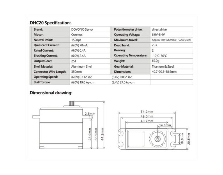 Doyono bietet hochwertige Servos zum kleinen Preis. Dieser leistungsstarke Hochspannungs-Servo mit Semi-Metal Gehäuse ist ideal für 1/8 und 1/10 Nitro Anwendungeny