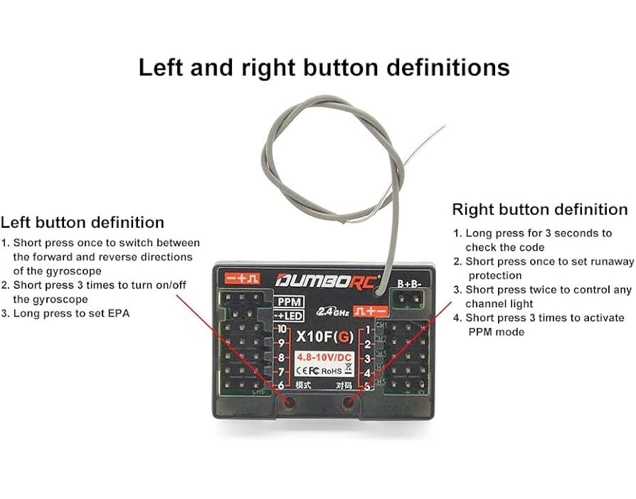Der DumboRC DR102 – auch bekannt als X10FG – ist ein hochmoderner 10‑Kanal‑Empfänger mit integriertem Gyroskop, der speziell für RC‑Autos, Boote und sogar Panzer entwickelt wurde. Mit seiner zuverlässigen 2,4 GHz‑FHSS‑Technologie, seiner kompakten Bauweise und einer enormen Reichweite bis zu 400 Metern ist dieser Empfänger die ideale Wahl für anspruchsvolle RC‑Piloten, die mehr Präzision und Kontrolle aus ihrer Fernsteuerung herausholen wollen.
