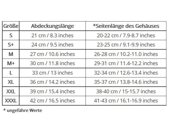 2. Nehmen Sie das Maß von der Länge einer Gehäuseseite. Wählen Sie nach dem Messergebnis eine von sechs Größen universeller Schutzabdeckungen aus.