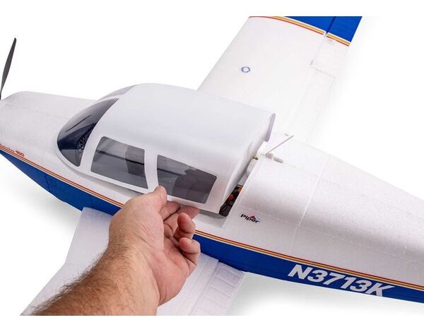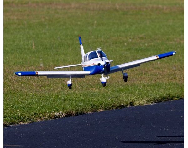 An accurate scale outline captures the iconic shape of the Cherokee including the constant chord wing that’s equipped with operational slotted flaps to deliver improved slow-flight handling and shorter take offs and landings. The unique full-flying stabilator (stabilizer/elevator) offers authentic pitch control and features an updated mounting system to reduce play for improved precision and control. A shock-absorbing nose strut featuring an improved design for easier maintenance and oversized wheels make it possible to fly from a variety of paved, dirt and even some grass surfaces. Plus, factory-installed LED lighting, including navigation lights, strobes on the wing tips, a tail beacon and landing lights, add to the scale realism and authenticity.