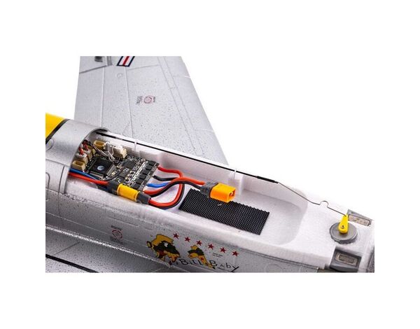 Die UMX™ F-86 Sabre ist mit einer Steuereinheit/Flightcontroller ausgestattet, die einen ESC und einen Spektrum-Empfänger enthält, der in Echtzeit die Telemetrie-Flugakkuspannung an kompatible Sender mit Spektrum AirWare sendet (einschließlich DX6e und 8e, DX6 G2/G3 und 8 G2, DX9, NX6, 8 und 10, iX12, iX20 und andere).