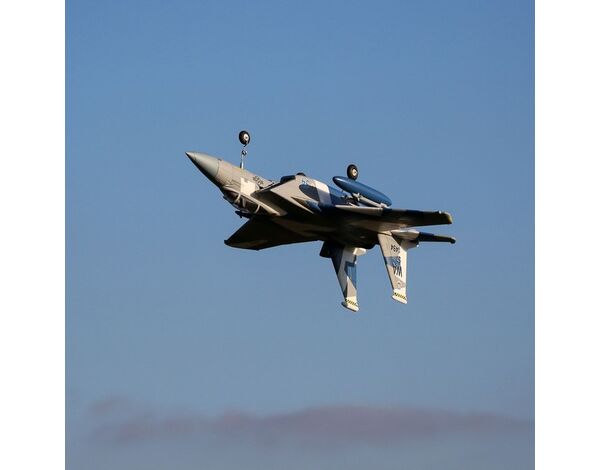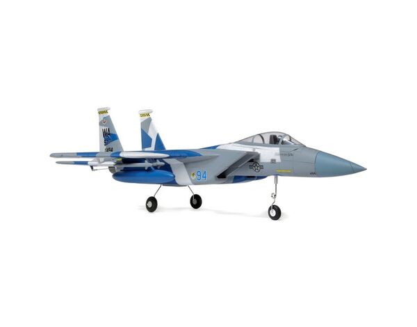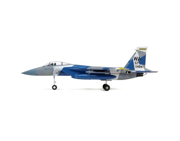 The E-flite® F-15 Eagle 64mm EDF jet is a replica of the world-renowned air superiority fighter flown by the U.S. Air Force. It's equipped with a 4S-compatible brushless motor and a 40-amp ESC that are matched to an 11-blade fan to deliver fantastic speed, thrust and a turbine-like sound. The factory-installed power system and servos help make it quick and easy to assemble the lightweight yet durable EPO airframe with bolt-on wings so you can be flying in less time than it takes to charge a battery. Optional-use fixed landing gear with a steerable nose wheel is included so you can taxi, take off and land on runways, or you can leave the landing gear off for improved performance plus easy hand launches and landings on grass. You can also fly with or without the wing-mounted drop tanks and missiles depending on the look and handling you prefer. And it all adds up to deliver one of the easiest to enjoy and easiest to fly Eagle models ever!