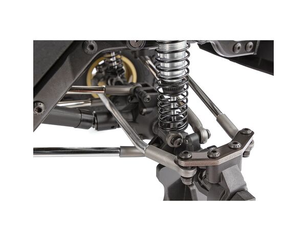 BTA-Lenkung und Aluminium-Lenkungsplatten: Die hinter der Achse angeordnete Lenkung verbessert den Anlenkwinkel, die Bodenfreiheit und die Optik. Durch die angeschraubten Aluminium-Lenkungsplatten werden Einstellbarkeit und Stabilität erhöht und ermöglichen Modifikationen durch den Benutzer.