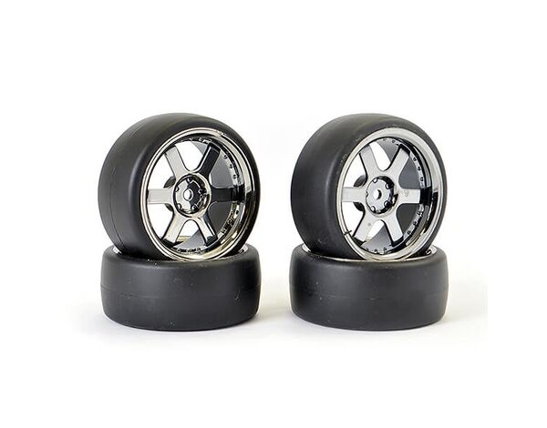 FASTRAX 1/10 (4) DRIFT D1 TYRE w/3MM 6-SPOKE WHEEL- BK CHROME
