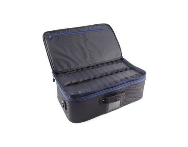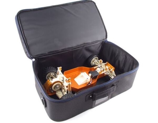 Designed for the 1/10th buggy or Touring Car racer who wants to travel light, this new tailor made bag is ideal for those trips down the club or test afternoon at the track. Integrated section with tool storage, zipped pockets inside flap and storage pockets within area. Can hold vehicle or wheels or tyres. Supplied with shoulder strap and finished in a cool carbon inspired weave.