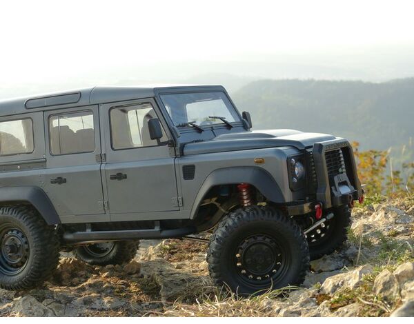 Unser Defender ist ein high-level Crawler im Maßstab von 1:8. Durch seine Größe und die hochwertig verarbeitete Scale Karosserie besticht er mit seinem Auftreten im Gelände. Durch Kombination aus hochwertigem, kohlefaserverstärktem Kunststoff, sowie erstklassig verarbeiteten Metall- und Aluminiumteilen, bietet das Chassis eine exzellente Geländefähigkeit.