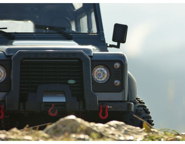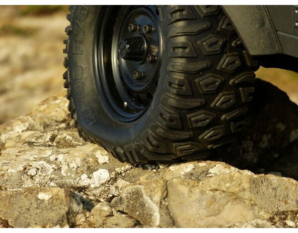 Den Bodenkontakt stellt der Defender durch seine superweichen Ultra-Grip Reifen, gepaart mit seinen originalgetreuen Metallfelgen her.