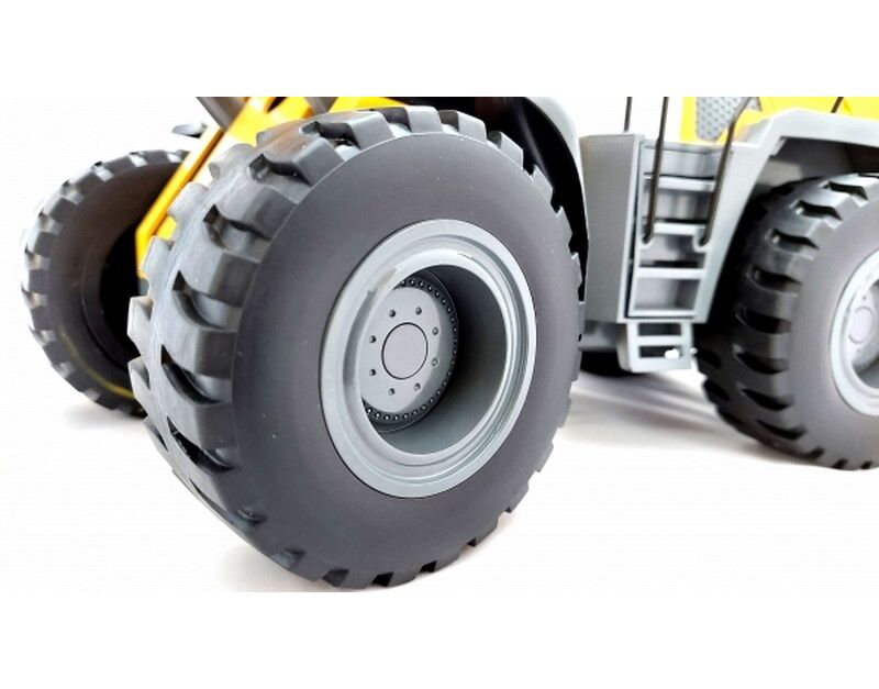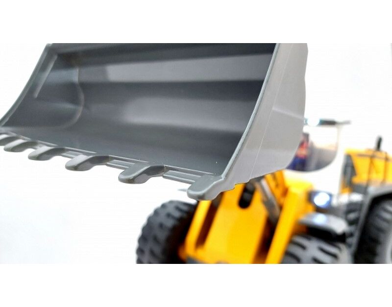 Modell hat den Maßstab 1:14 und lässt fast keine Wünschen offen. Der Arm, die Schaufel, der gesamte Lader ist separat vollproportional steuerbar. Das Modell verfügt zudem über einen Soundgenerator. Dieses hochwertig verarbeitete und maßstabsgetreue Modell eines Radladers schließt die Lücke zwischen Spielzeug und extrem hochpreisigen Funktionsmodellbau. Insgesamt können bei dem Modell 10 Kanäle angesteuert werden. Somit steht das Modell dem Original in nichts nach. Alle Getriebeteile sind aus Metall und das Modell verfügt zudem über kräftige Stellmotoren, welche auch schwere Lasten problemlos bewältigen! Die Qualität und detailtreue dieses Modells sind bisher als RTR Modell einzigartig. Die Armgelenke sind über Spindelantriebe realisiert, was technisch in diesem Preissegment einzigartig ist!