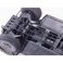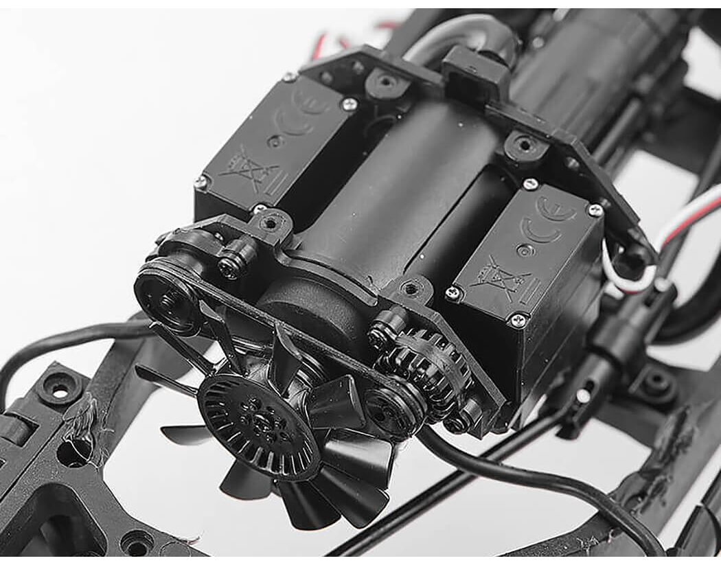 Power comes from a 370-motor hidden inside the scale engine casing. However, the gearbox need not be hidden as these gear assemblies operate within the gearbox housing. Two servos are positioned on either side of the motor and respectively control both the switch between high and low speed gears and the operation of the transfer case, thus switching between rear drive and four-wheel drive. Power from the transfer case is transmitted to the front and rear axles via a pair of metal driveshafts. Both the front and rear differentials also have a differential lock function, each driven by a servo which can be locked by remote control. Four metal drive shafts transmit power at each corner of the vehicle from the differential to the reduction gear assembly, commonly known as a "portal axle".
