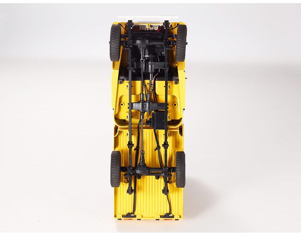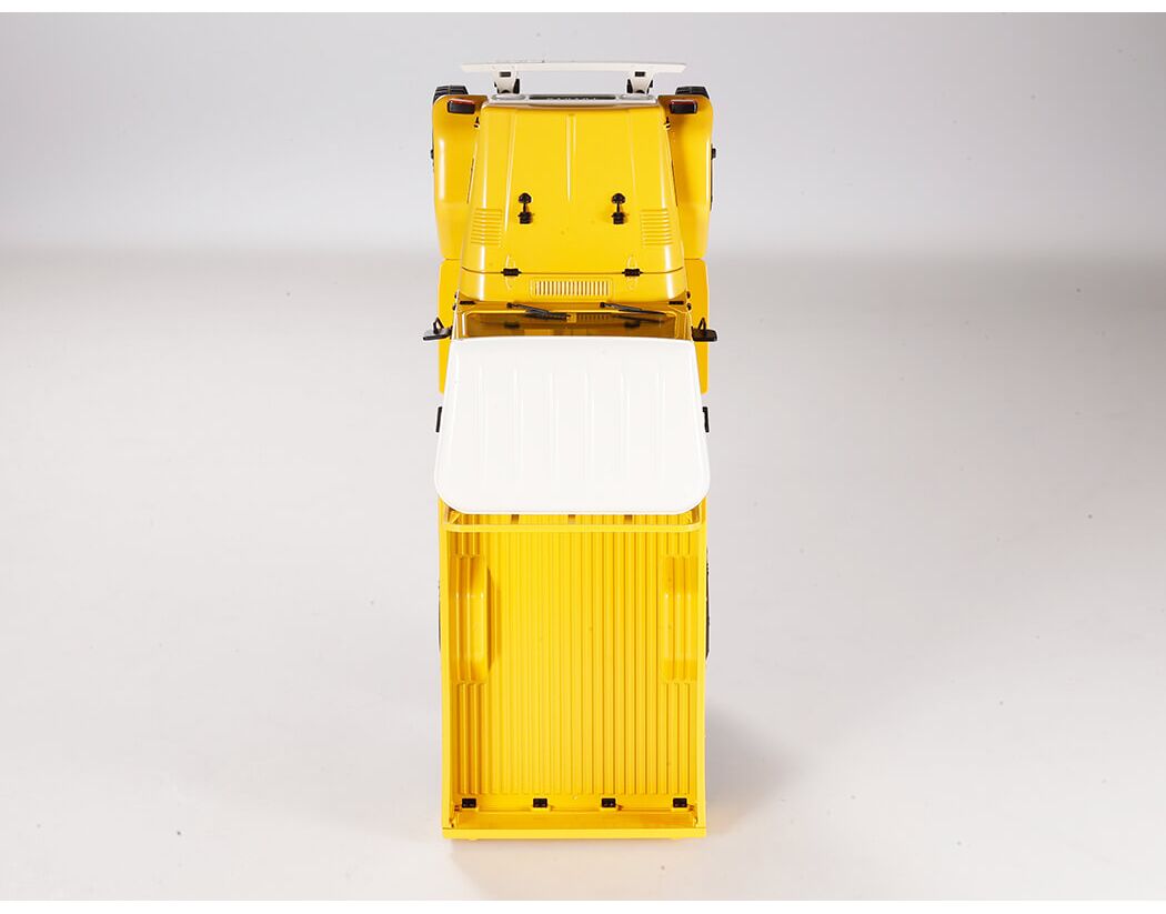 The two-speed gearbox provides powerful torque. Metal gears carry power, allowing it to move forward slowly even if it is fully loaded with gravel. The TOYOTA logo on the rear of the car restores the stereoscopic stamping effect of the steel plate of the real car. The tailgate can be opened to load extra-long "cargo". There are two sets of tail-lights on the left and right of the tailgate, each set includes a turn signal, a brake light, and a reversing light. With the input of the light control button on the transmitter, the linkage effect is consistent with the driving action. The front headlights have linkage effect of far and near beam and turn signal.