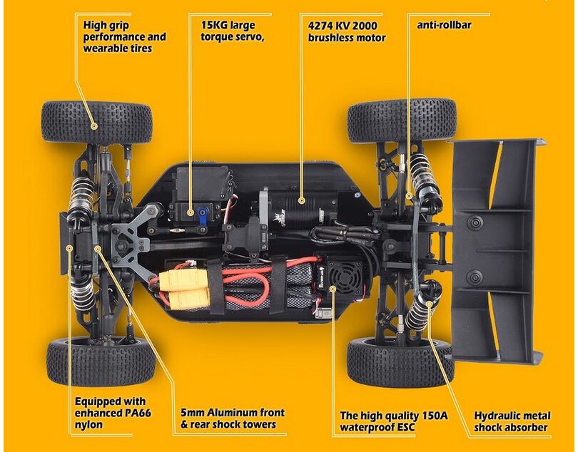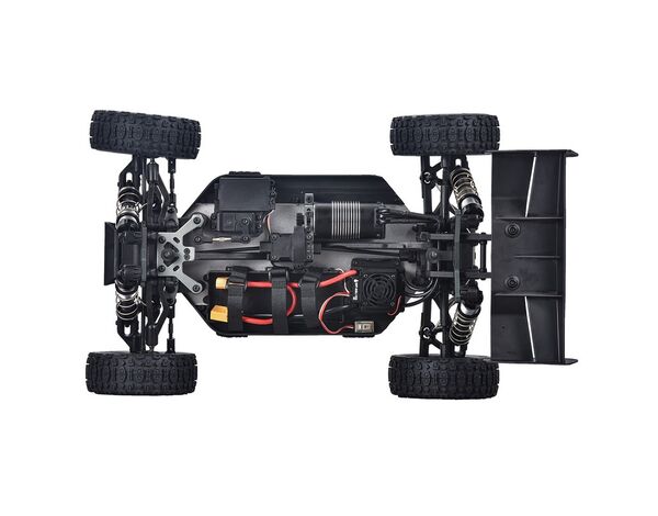 Das durchdachte Design mit Allradantrieb, stahlverstärktem Antriebsstrang und hochwertigen All-Terrain Reifen sorgt für perfekte Traktion auf jedem Untergrund. Aluminium-Öldruckdämpfer, robuste Differentiale und ein präzises 15kg Servo garantieren dabei optimale Kontrolle und ein realistisches Fahrgefühl.