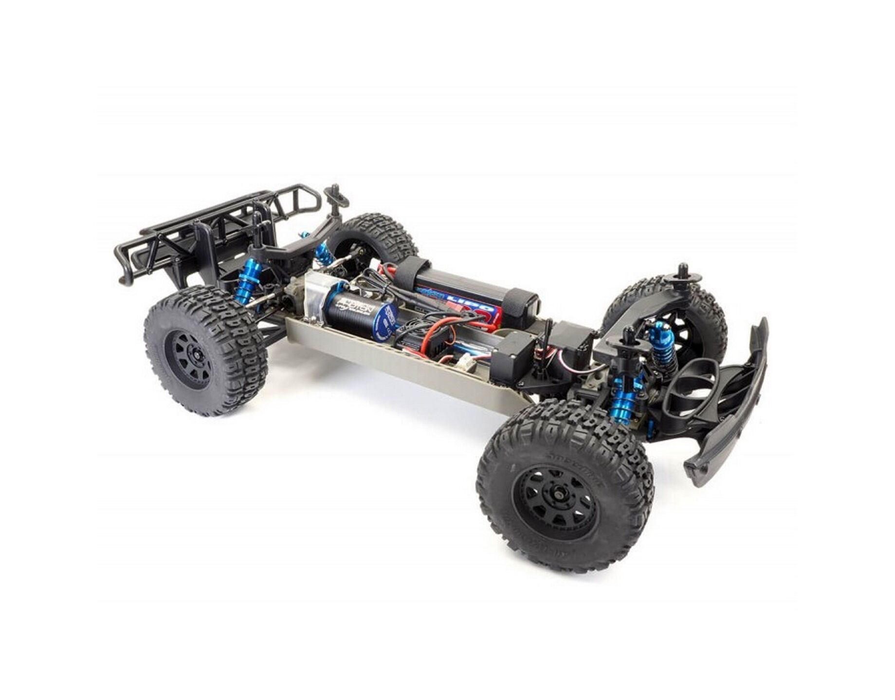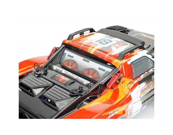 On top, the stylish semi-scale Trophy Truck Apache body features impactful graphics resulting in an eye-catching vehicle in either blue and red, topped off with moulded roof skid rails, roof LED light bar and rub-ber front mud flap.