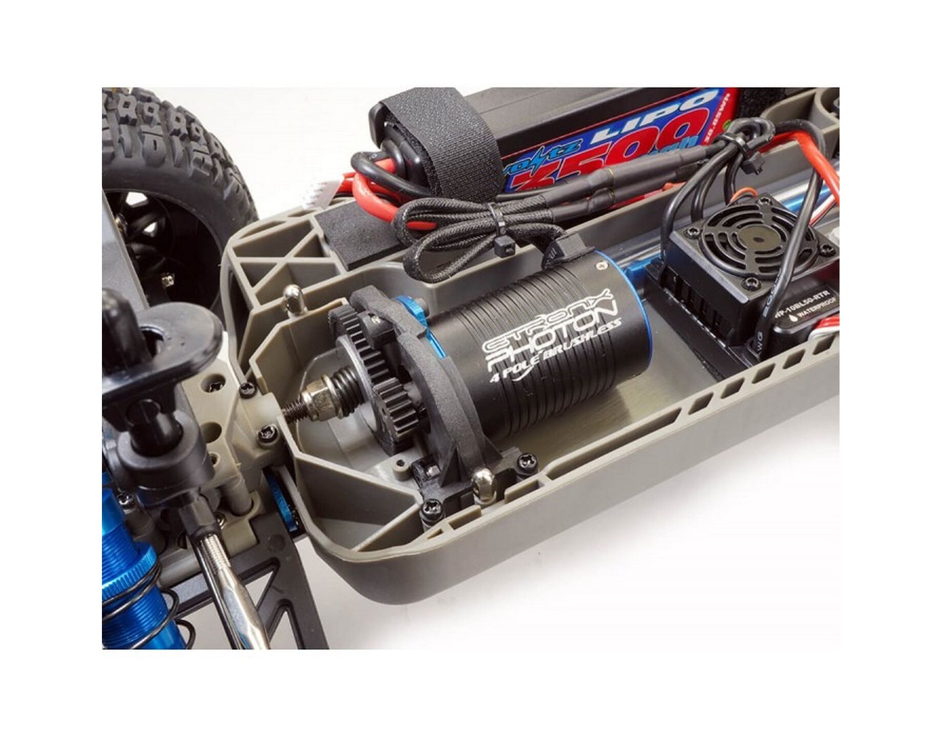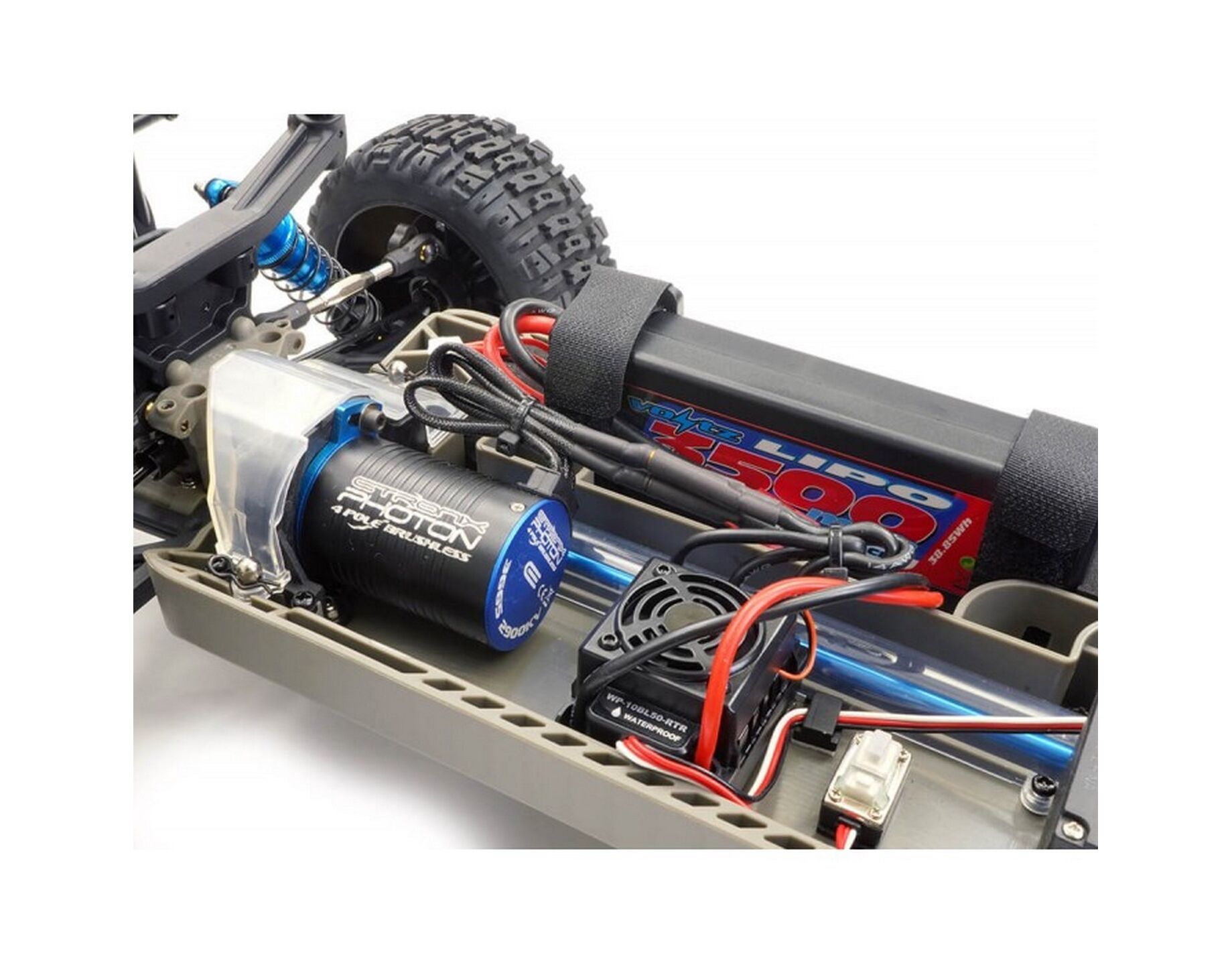 Power to the sealed, shaft driven 4wd system is supplied by a Voltz 3S Lipo battery, Hobbywing 50A speed control and brushless 2500kv motor for some exhilarating high-speed off-road fun.