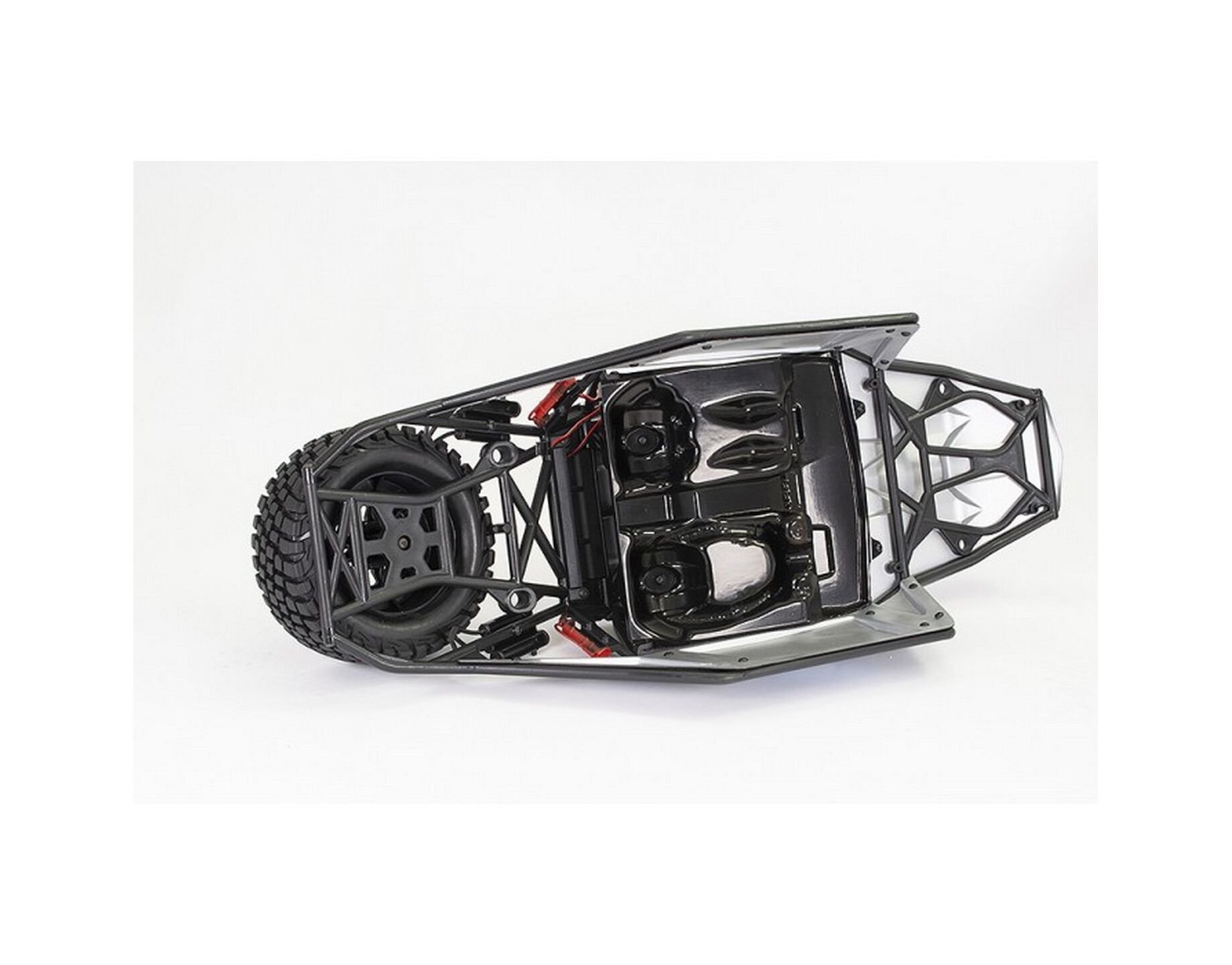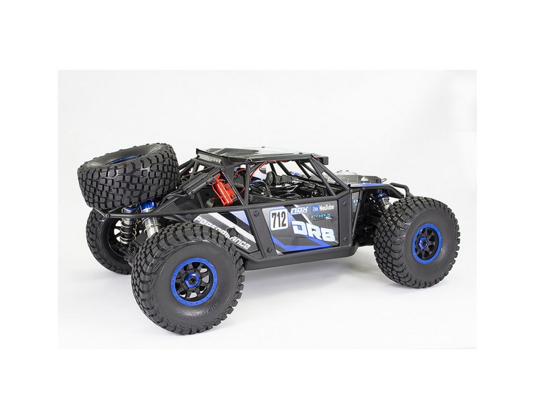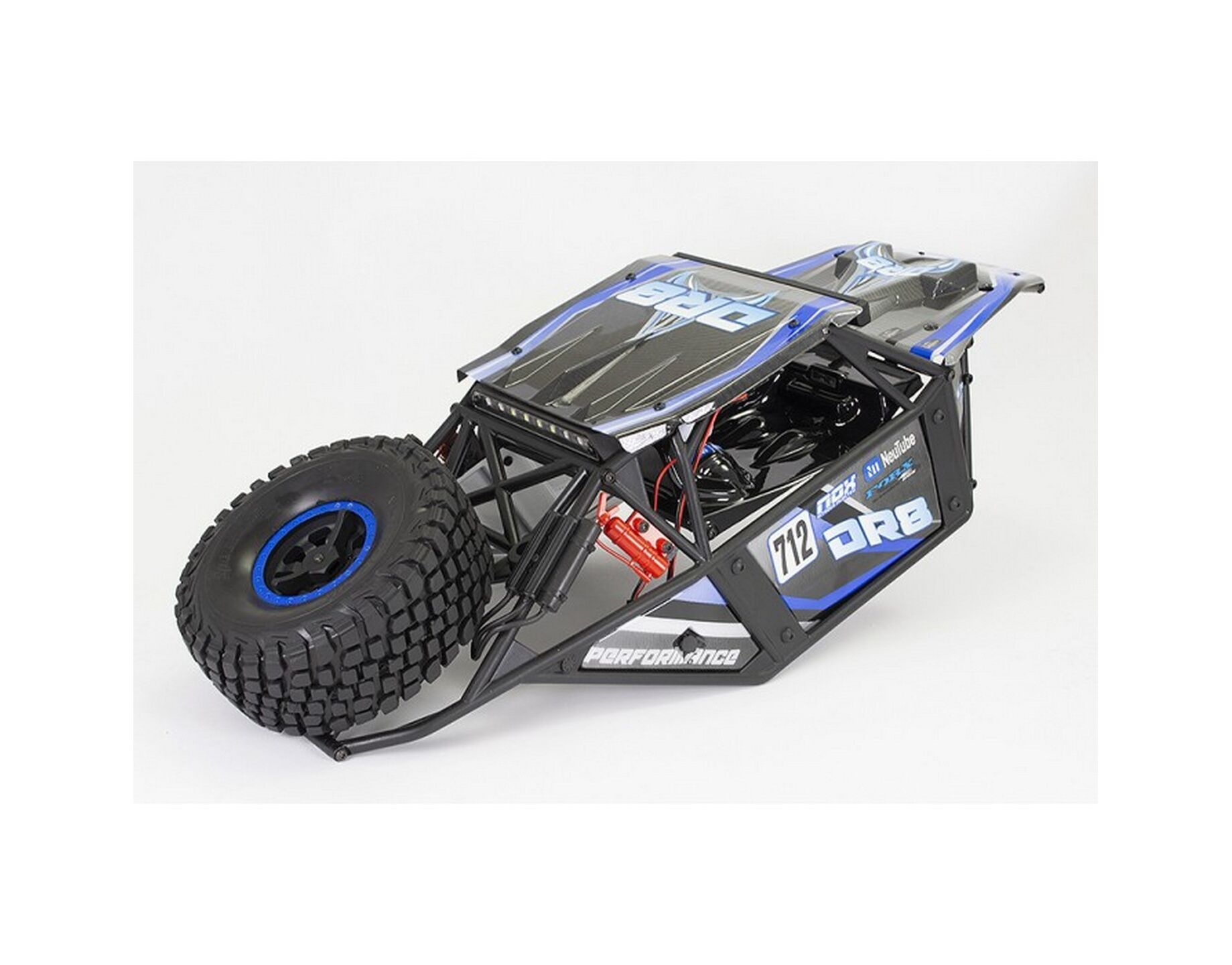 The DR8 is topped off with a classic, desert buggy inspired moulded tubular roll cage frame with printed lexan panels and spare wheel. A detailed interior driver cockpit, painted fire extinguishers are all rounded off with super bright front and rear LED light bars.