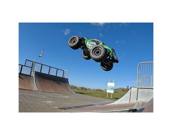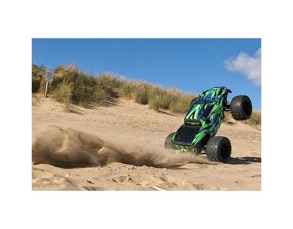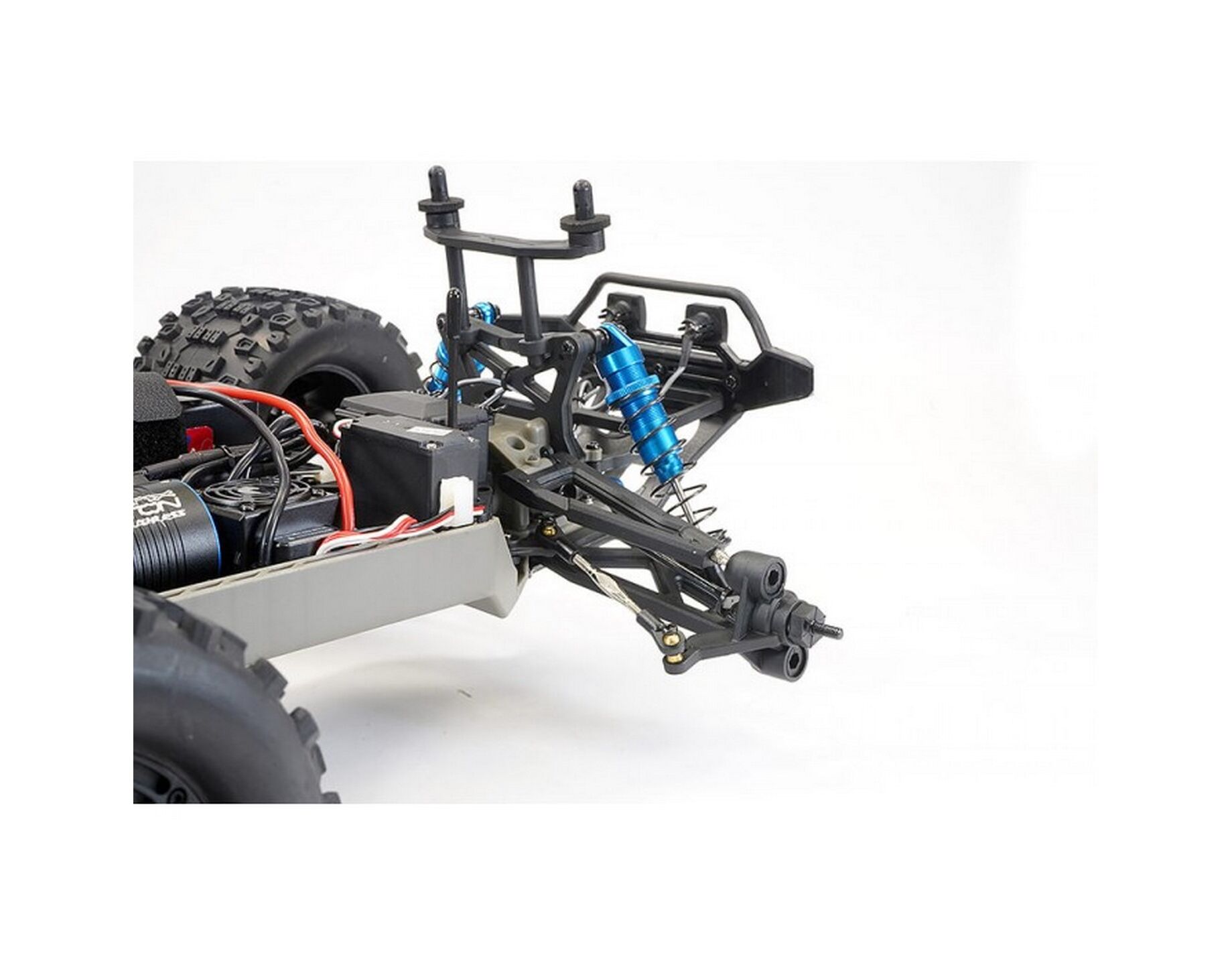 Powered by a Hobbywing 50A brushless speed control and 2500kv motor, coupled with the included Voltz 3S 3500mAh Lipo battery the RamRaider can reach impressive top speeds for its size, while still being very drivable on most surfaces. The rear mounted wheelie bar works to provide a sta-ble footing for those heavy accelerations when you light up the rear tyres.
