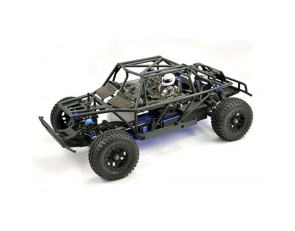 Front and rear fully independant suspension features oil filled shock absorbers, adjustable turnbuckles and anti-roll bars for fine tuning. Flexible front and rear wide tubular style bumpers and skid plates protect, while the pre-printed bodyshell covers an internal roll cage and driver cockpit.