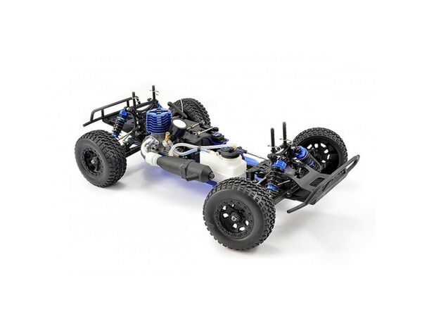 Front and rear fully independant suspension features oil filled shock absorbers, adjustable turnbuckles and anti-roll bars for fine tuning. Flexible front and rear wide tubular style bumpers and skid plates protect, while the pre-printed bodyshell covers an internal roll cage and driver cockpit.