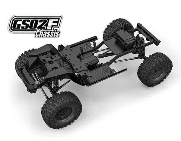 Weight balance of the GS02F chassis is leaning forward. This increases traction of the front wheels and provides better crawling performance at high angle hills or rocks. It also minimizes rolling over backwards when climbing.