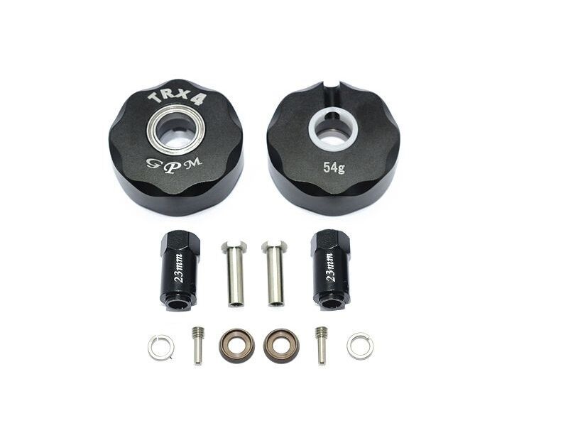 GPM Racing - TRAXXAS - TRX4 DEFENDER TRAIL CRAWLER - TRX4023E Aluminum Pendulum Wheel Knuckle AXLE Weight + 23mm Hex Adapter Gewichtstuning und Spurverbreiterung für den Traxxas TRX-4 This item is suitable for TRAXXAS TRX4 Defender Trail Crawler and TRAXXAS-1/10 TRX-6 MERCEDES-BENZ-88096-4 This product includes : 23mm Hex Adapter-2PCS Stainless Steel Screw Shaft M4x2.5x11-2PCS 5mm Spring Steel Shims-2PCS 5mm Metal Washer-2PCS 19mm Stainless Steel Hex Socket Screws-2PCS Product major function & usage: To increase the weight of each wheel to stabilize the wheel, enlarge the angle of crawling, especially when the car is digging into some low lying area landspaces, grab the ground firmly and smoothly drive back to level. This part is designed with a bearing in the middle with a delrin collar, the weight pendulum is made narrower on the top and wider at the bottom to allow you to crawl in different angles. The additional weight is kept downward so the crawler is more grabby to the