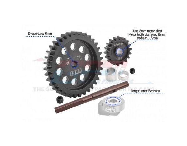 GPM TRX XRT- XMAXX Hauptzahnrad 40Cr Carbon-Stahl M1.5 35Z +Ritzel 18Z (1) Made of 40Cr Carbon Steel, stronger than the original gear, wear-resistance and better transmission. (2) The upgraded 40Cr Carbon steel Spur Gear 35T M1.5 and large gear shaft, bearing and aluminum 7075 fixed mount bring out three-point support, which is better than the original two-point support in stability and transmission effect. (3) Motor tooth diameter: 8mm, module: 1.5mm, number of teeth: 18T (4) Spur Gear 35T diameter: 6mm, D-shaped motor gear hole, module: 1.5mm, number of teeth: 35T,tooth surface width: 14mm,Outer diameter: 55.4mm Package includes: Motor gear 18T-1pcs Screw shaft 5x5-1pcs Spur gear 35T M1.5-1pcs Cush drive input shaft-1pcs Bearing 6x13x5-1pcs shim 6x8x3.5-1pcs shim 6x8x7.5-1pcs Set screws 5x5-1pcs Aluminum 7075 mount-1pcs