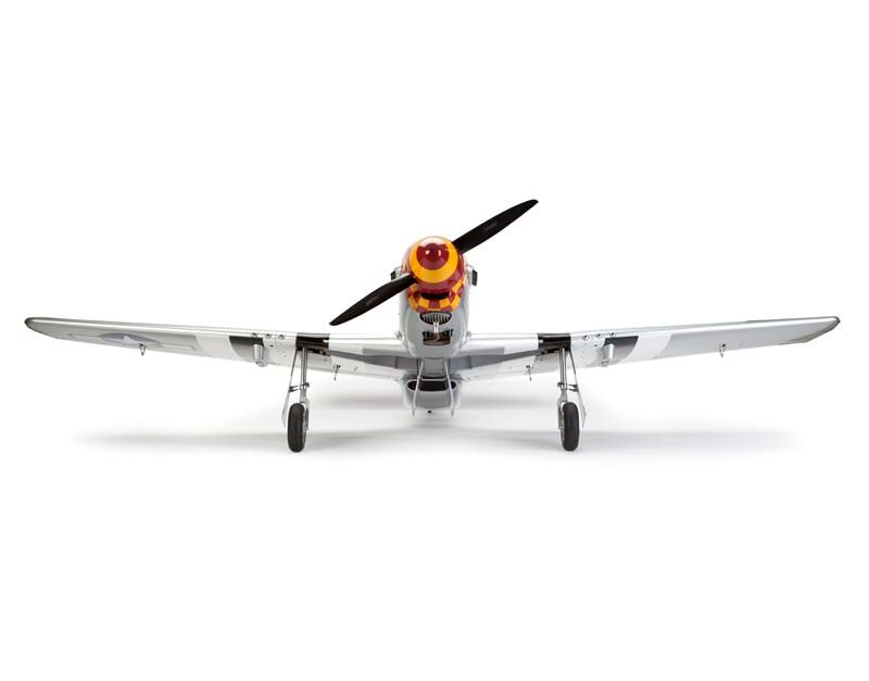 Das anlenkbare Spornrad verfügt ebenfalls über Klappen und kann optional auch durch ein elektrisches Einziehfahrwerk ersetzt werden Mit der originalen UltraCote Folie hat die Mustang eine leicht zu pflegende Oberfläche, die der eines bemalten, restaurierten Full-Size-P-51D Modells in nichts mehr nachsteht.