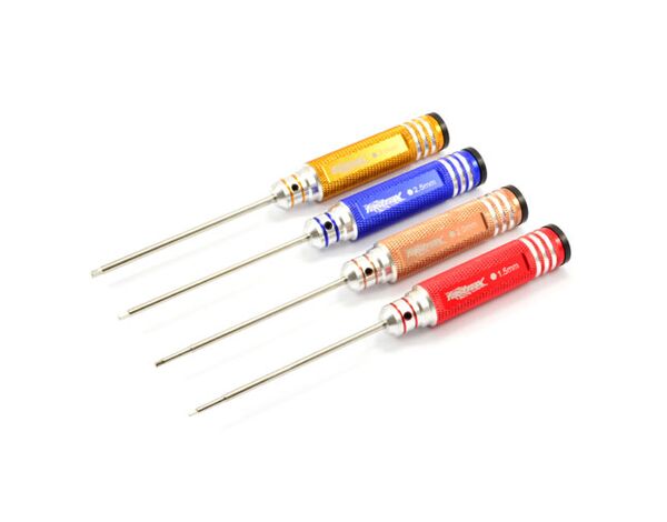 Inexpensive set with aluminium machined and anodised handles. Hard bit. Four metric sizes - 1.5mm, 2mm, 2.5mm and 3mm.