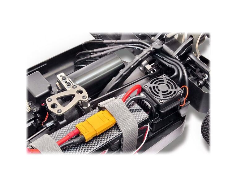 Der eingebaute 2.000kV Brushless Motor bietet zusammen mit dem wasserdichten 150A Regler ungebremsten Spaß. Die für Rennstrecken ausgelegte Fahrwerksgeometrie lässt problemlos aggressives und zielgenaues Lenkverhalten zu. Eine optimale Gewichtsverteilung garantiert dabei zusätzlich perfekte Sprungbalance und die verbaute Elektronik ist von hervorragender Qualität.