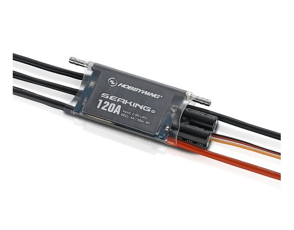 HW30302361 Hobbywing Seaking Pro 120A Pro Bootsregler 2-6s, 4A BEC Die Seaking Serie von Hobbywing ist DIE Serie für den Bootsmodellbau. Egal ob Hobby oder High-End Wettbewerb, hier gibt es für jeden das Richtige. Wasserfest durch Nano-Coating Technologie.Wettbewerbs Design Speziell entwickelt für den Wettbewerb ist der Pro 120A extrem leicht um besonders geeignet für die Wettbewerbsklassen, wo geringes Gewicht und eine hohe Leistung bis zu letzten Sekunde gefragt ist. Die Software wurde ebenfalls für den Top-Level Wettbewerb entwickelt und garantiert eine erstklassige Kontrolle des Models und jede Menge Möglichkeiten die Parameter zu programmieren um den verschiedensten Wettbewerben und Wettbewerbsbedingungen gerecht zu werden. Eingebautes Hochstrom BEC Das integrierte Schaltbare BEC besitzt eine maximale Leistung von 8Amp und kann 6V bzw. 7,4V zur Verfügung stellen. Somit können nahezu sämtliche Servos wie auch Hochs-Volt Servos betrieben werden. Innovative Turbo Funktion Der Pro 120A ist der weltweit erste Bootsregler welcher eine Turbo-Timing Funktion besitzt. Dank dieses sofortigen Turbo-Boost lässt man jeden Gegner augenblicklich hinter sich. Wasserdichtes Design Der Regler ist zu 100% wasserdicht wodurch es keinen weiteren Schutz bedarf. Hohe Zuverlässigkeit & Leistung Gebaut aus den modernsten und hochwertigsten Komponenten wie z.B. MOSFET's mit einem extrem niedrigem Innenwiederstand. Dies gekoppelt mit der modernsten Firmware machen den Pro 120A extrem Zuverlässig und erlauben eine erhöhte Strombelastbarkeit. Es sind verschiedene einstellbare Sicherheitsoptionen im Einsatz wie ein Unterspannungsschutz, Überhitzungsschutz oder ein Signalverlustschutz. Effizientes Kühlsystem Das Hobbywing patentierte Kühlsystem mit Kupferschienen über der Hauptplatine des Pro 120A kann die Temperatur effizient und effektiv an die integrierte CNC gefertigte Aluminium Wasserkühlung abführen und somit den Regler immer so kühl wie möglich halten. Firmware Upgrade Die Firmware des Seaking Pro 120A Reglers lässt sich einfach über die USB Link Software, welche auf der Hobbywing Webseite heruntergeladen werden kann, aktualisiert werden. Dazu wird jedoch ein PC und die multifunktionale LCD Program BOX von Hobbwing benötigt. Technische Daten: Konstanter Strom: 120A Kurzzeitig max. Strom (0.1S): 760A BEC Ausgang: 6V/7.2V schaltbar, Konstant 4A (Switch-mode BEC) LiPo Zellen: 2-6S LiPo Gewicht: 87,5 g. Durchmesser Wasserkühlungsleitung (mm): Innen :2.0 / Außen:5.5 Abmessungen (LxBxH): 96,6 x 37,9 x 10,3mm (inkl. Wasserkühlung) Haupteinsatzgebiet: Eco, Mono 1 und andere Rennboote (Länge < 100cm)