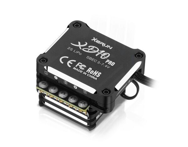 Hobbywing Xerun XD10 Pro Schwarz Drift Brushless Regler 100A, 2s LiPoFür den richtigen Drift in der Kurve sorgt der Xerun XD10 Pro-Regler. Mit seinem stylischen Lüfter aus Aluminium bleibt der Regler selbst bei den heißesten Fahrten stets kühl. Und unterstützt wird die optimale Performance außerdem von den ultraweichen 13AWG Silikonkabeln. Denn dank des geringen Widerstandes und der Flexibilität, bereiten diese keine Probleme.Eigenschaften:Eingebautes Switch Mode-BECÜber 30 Parameter zur persönlichen EinstellungVariable Frequenzregelung der PWM- und BremsfrequenzenDiverse Schutzfunktionen vorVerpolungÜberhitzungUnterspannungsabschaltungSignalverlustDatenprotokollierung von Temperatur, Drehzahl u.v.m.Firmware-Upgrades möglich, um immer auf dem neuesten Stand zu seinTechnische DatenTyp: Brushless, SensoredStrom dauer/kurz: 100A / 800AEingangsspannung: 2S Lipo / 2-4 Zellen NiMHBEC: 5V - 7,4V bei 5A (in 0,1V Schritten)Motor-Typen: 3650er Brushless Motore
