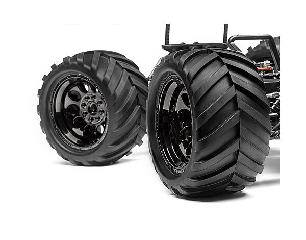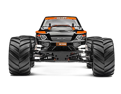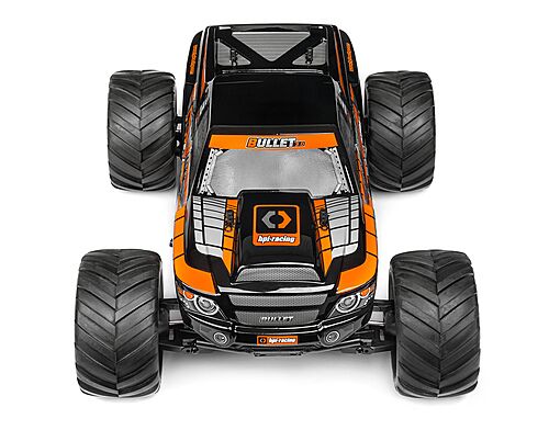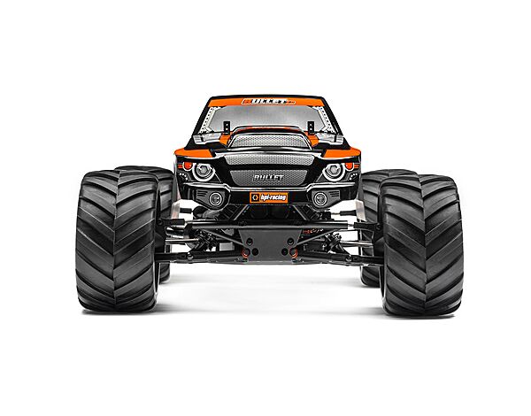 Mit seiner großen Pickup Truck Karosserie und den Traktorprofil Reifen hat der Bullet MT genau den klassischen Monstertruck Style nach dem Sie suchen! Die Lackierung ist ein komplett neuer Entwurf in Schwarz, Silber und Orange - kombiniert mit Mehrspeichen Chromfelgen in Schwarz für eine vollkommene Optik! Das Styling der Front wird durch die klassische Pickup Truck Optik mit dem Kühlergrill und den Frontscheinwerfern erweitert und die Dachschwellen vervollständigen die kraftvolle Optik des Bullet Trucks. Weitere Rennsport-Akzente werden durch die Front und Heck Rammer und Fensterdetails inklusive Überrollkäfig und Fensternetzen gesetzt. Mit den Traktorprofil-Reifen auf den schicken Chromfelgen in Schwarz glänzt der Bullet MT in jeder Situation und wird Sie und Ihre Freunde begeistern!