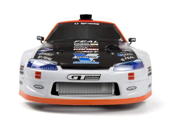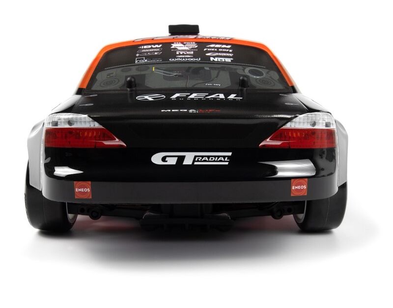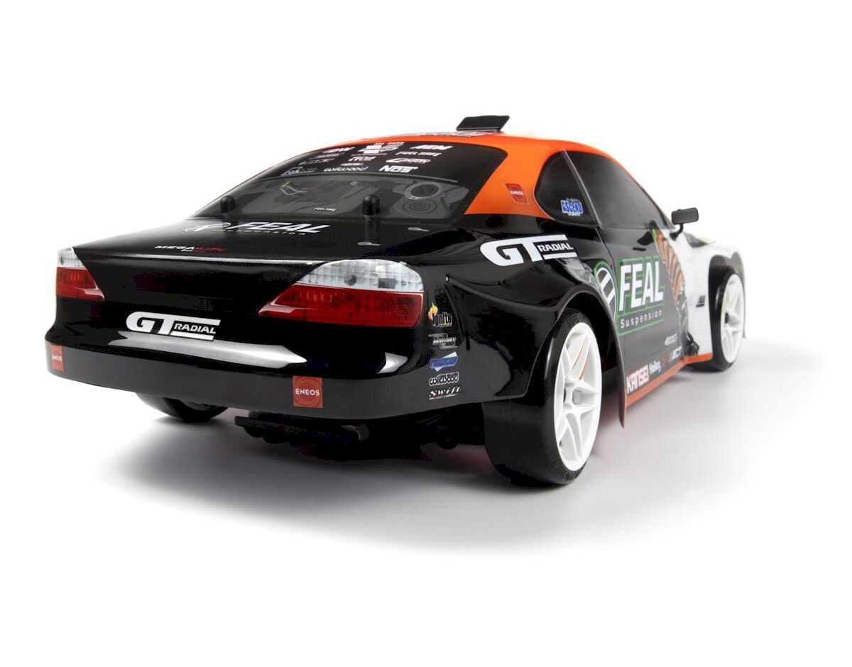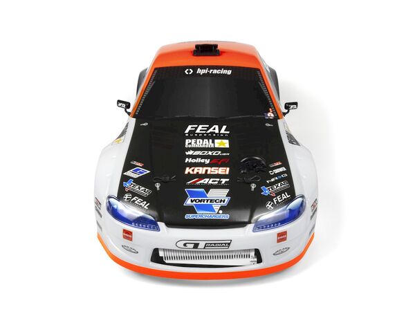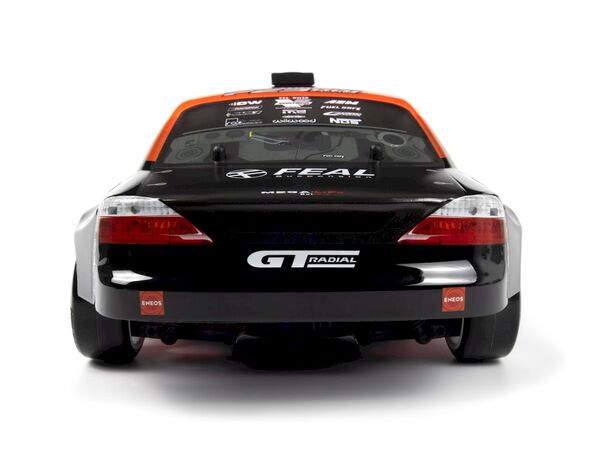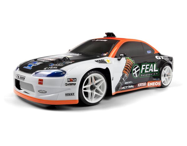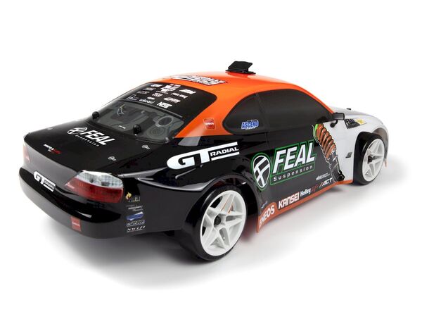 Offiziell lizenzierte Nissan Silvia S15 Widebody Karosserie: Eine detaillierte Nachbildung im Maßstab 1:10, mit der markanten Lackierung des Feal Suspension Race Teams. Details wie Spiegel, Kompressor, Ladeluftkühler und Dachlüftung sind enthalten.