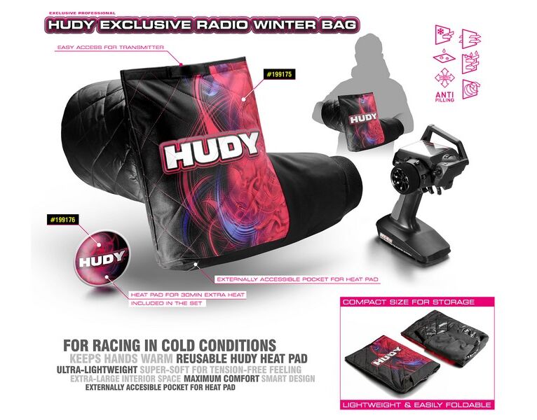 Exclusive radio winter bag is a “must have” for every RC car driver racing outdoors in cold conditions. The winter bag for right-handed drivers will keep hands warm no matter the outside temperature thanks to the reusable HUDY Heat Pad.
