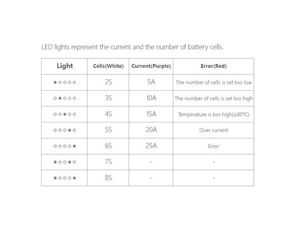 Warnungen über LED Signale: falsche Zellenzahl Einstellung, Übertemperatur, Überstrom u. sonstigen Fehlern