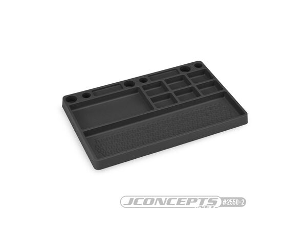 Performance in the pits is just as important as it is on the track. The JConcepts parts tray provides a great platform for organization with its detailed design, divided pockets and steady base weight. The tray is precision molded in a rubber material which shows well in any pit area with the available blue and black color options.