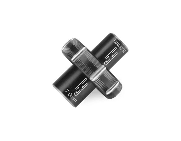 The two most popular sizes for hex nuts in the RC industry now have a convenient wrench capable of handling both in a single wrench. The JConcepts 5.5 | 7.0mm combo wrench has major flexibility packed into a compact one-piece design. The light-weight, machined aluminum wrench is available in blue and black anodized colors and features a dual-end concept. The main hub of the unit has been knurled for finger tip control and features several heavy cuts for increased grip for those, pesky, hard to turn lock-nuts. The sizing is indicated by laser etching on each end and topped off with JC logo for authenticity.