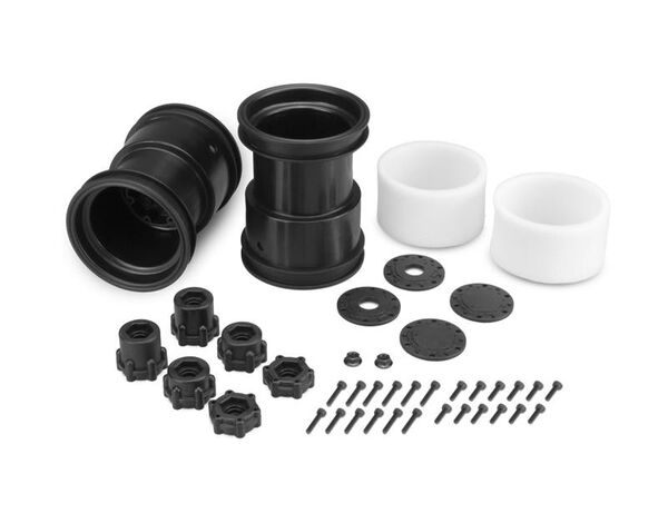 J3377B JConcepts Tribute - 2.6 x 3.6 Monster Truck Felge mit Adaptern (Schwarz) - 2 St. (Passend für 3168 3169 MT Reifen Axial SMT10) The Tribute 12mm wheel by JConcepts packs an assortment of options into a design and style that mimics the golden age of Monster Truck racing. With a list of design considerations, the team went to work on a simple and durable one-piece wheel design that was first stout and second versatile. It was important to incorporate an adaptor which could alter the off-set but also maintain a certain look made popular in the hard-core side-by-side racing days. The stepped design reduces weight but also adds rigidity for the ultimate bash and play wheel. The Tribute wheel includes three, 12mm hex off-set wheel adaptors. 11mm width for a stock Clod Buster or retro type Monster Truck width, 18mm for increased stability on standard wheelbase trucks and 25mm for the ultimate in footing for long wheelbase race trucks. The adaptors are installed with 6 x 2.5 x 12mm sc
