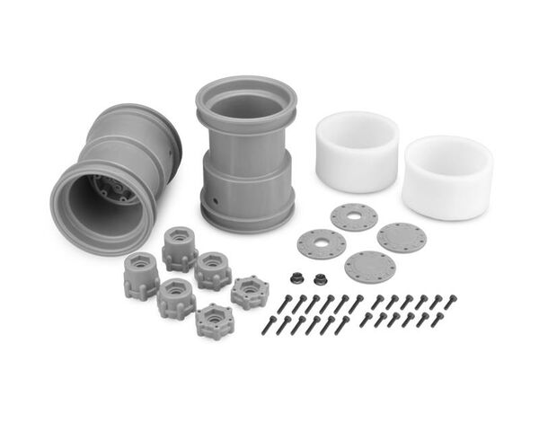 The wheels include open and closed planetary caps which attach with 6 x 2.5 x 8mm screws. The planetary caps support a scale look as well as a quick change racer function to suit individual needs. The wheel set includes a slim, open cell insert, which can be installed as a cushion but also provides an equal platform for the tire insert to rest against. Also included is a pair of steel, serrated, 4mm thin pattern lock-nuts for greater security.
