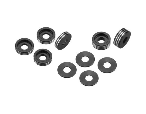 J8111 JConcepts Dirt Racing Products - Vertiefte Kugelbolzen Unterlagscheiben - Satz (Schwarz) (Passend für die meisten 1/10th Offroad und Onroad Fahrzeuge) Brian “Dirt” Kinwald unleashes another of his trick personal touch items to market. The recessed washer set is designed to offer two adjustments while utilizing a single washer. The 2 and 3mm washers feature a 1mm recess; this allows a driver to simply flip orientation for desired height. The large diameter of the washer provides a steady footing against plastic and aluminum components while the milled and recessed grooves easily indicate which height is in hand. Included in each package are four pieces of the 2 to 1mm washer and two pieces of the 3 to 2mm washer. In addition, a .5mm shim is also included for the ultimate in fine tuning adjustment and can be used alongside the recessed washers. Anodized in black, the new washers can be used as a technical tuning option or simply during a “black-out” vehicle build. If an