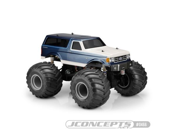 The 1989 Ford Bronco body built and fit for RC monster truck lovers offers first class styling and its exterior is accentuated with a smooth and molded front bumper. The 1989 Bronco carries over the same body style from the previous generation yet sports a new rounded front clip that improves vehicle aerodynamics over its predecessors. The softened body lines around cab which transition to the Bronco’s rear roof seem very seamless and full of vintage grunt. Large fender flares around the wheel wells provide the scale monster truck look and clearance for JConcepts Racing Tires.