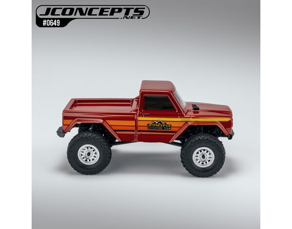 Die Karosserie wird aus klarem Polycarbonat gefertigt, ist werkseitig zugeschnitten und mit Schutzfolie versehen. Details wie eckige Frontscheinwerfer, horizontale Blinker, kantige Seitenteile, angedeutete Rücklichter und eine klare Trennung zwischen Kabine und Ladefläche sorgen für einen authentischen Scale-Look. Die schmale Front (68 mm) ermöglicht maximale Lenkfreiheit für beliebte Reifen wie die JConcepts Tucks oder Landmines.