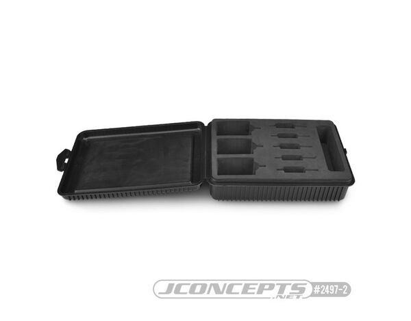 The motor | rotor box has a small footprint which makes it ideal for short trips with minimal amounts of space. Inside the box is roomy enough for three assembled motors and cushioned with high-impact foam that allow the items to lay in a bed like a cradle during rest periods. At the other end, five areas can house rotors and the pocket at the end gives all-important extra storage. The foam insert material has a grabby feel and allows the user to manipulate to grab needed items. The custom built storage box, molded black in color has JConcepts.net logo for authenticity and built-in plastic latch for easy open and close operation.