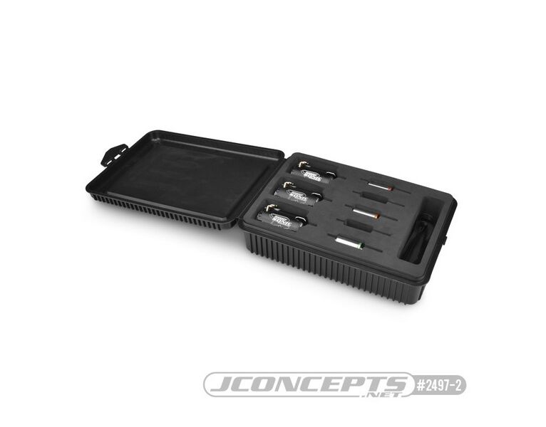 Being organized is the name of the game. The best organized, best prepared racers are typically the ones reaching for that top step of the podium. JConcepts has reached into their bag of tricks to help racer organization. The motor | rotor box includes plenty of space for assembled motors, individually spaced rotors and a pocket for miscellaneous motor tuning items.